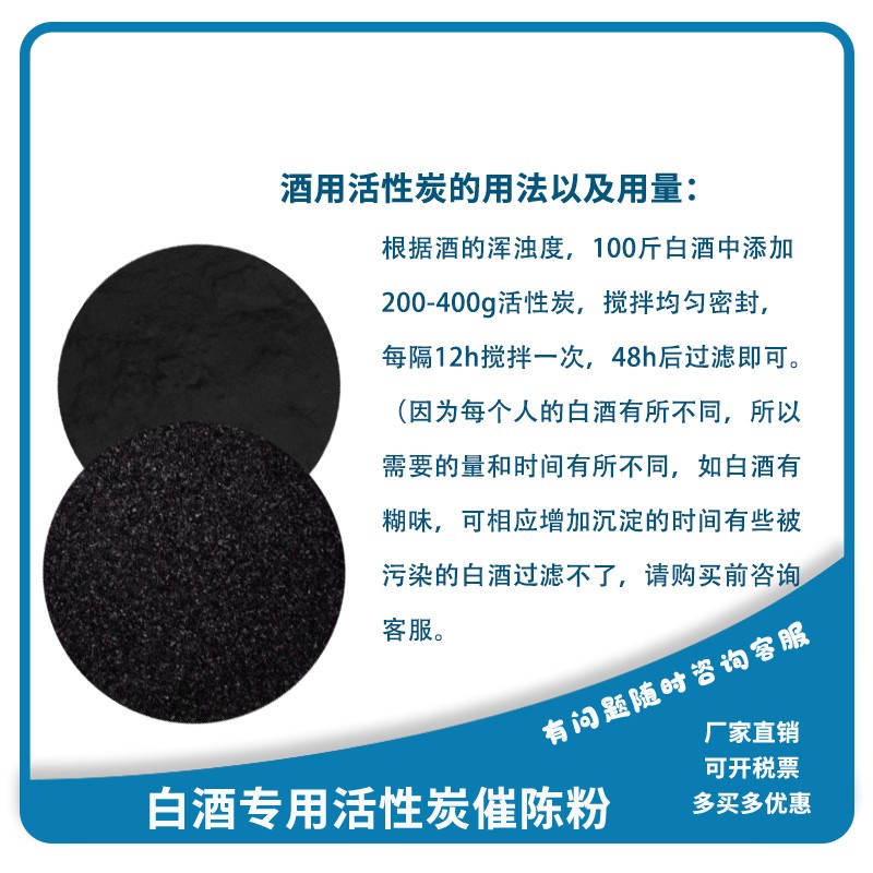 選用優質木屑、果殼、椰殼等原料精制而成的酒用粉狀活性炭,主要作用于低度酒除濁、催熟、陳化。去除酒精及高度酒中的異雜味,防止高含酯量低度白酒低溫下渾濁。