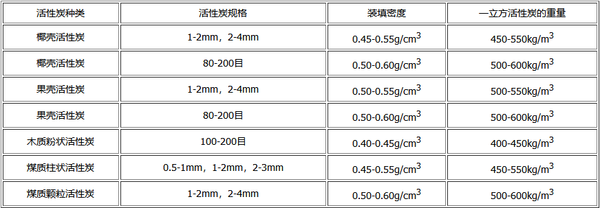 下表是竹之韻活性炭廠家根據我公司產品的實際情況,為大家總結幾種不同類型活性炭產品的裝填密度,以及不同規格、種類活性炭一立方的重量,希望對大家有所幫助。