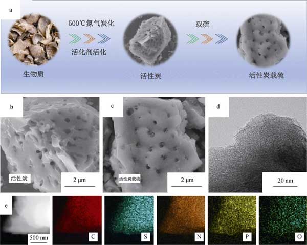 首先,除去生物質的污垢和表面雜質,用清水徹底清洗活性炭原材料,然后用蒸餾水反復清洗,然后將它們粉碎成碎片,然后在烤箱中100°C下干燥。為了進行預碳化,將干燥的生物質在氮氣氛下的真空管式爐中在500°C的溫度下熱解2小時,以去除少量有機分子。隨后,為了通過化學活化提高比表面積,將預碳酸化的生物質以1:4的重量比浸入作為化學活化劑的水溶液中,然后充分攪拌6小時以確保完全滲透。之后,將混合物在N 2下于900°C退火1小時。最后,用鹽酸反復洗滌退火后的樣品,然后用過量的蒸餾水沖洗以獲得中性pH。最終樣品通過在80°C的空氣中干燥獲得,并標記為多孔活性炭。相比之下,使用相同步驟制備的未添加活化劑的產品被標記為無孔活性炭。接著使用這兩種活性炭升級成加硫復合材料,將升華后的硫(純度>99.95%)和相應的活性炭粉末(重量比為60:40)充分混合并在研缽中研磨。然后,將獲得的混合物用特氟隆容器密封在高壓釜中。在155°C下熱處理12小時后,獲得了多孔摻硫活性炭和無孔摻硫活性炭復合材料。