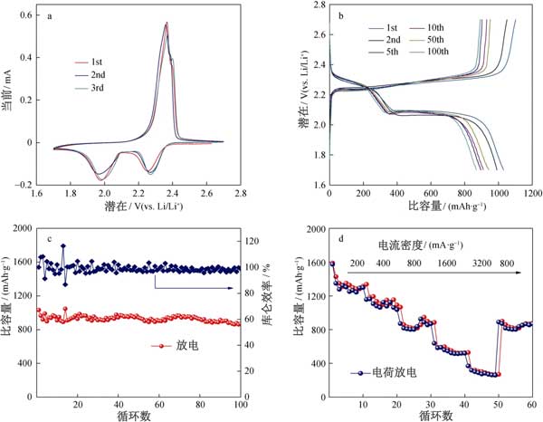 為了評估活性炭作為陰極的電化學性能,將鋰箔作為陽極組裝到鋰硫電池的紐扣電池中。用于第一,第二和第三個循環的循環伏安圖(CV)曲線上在0.05毫伏·秒的掃描速率的電位窗口進行(圖2A)。在第一循環期間,觀察到兩個陰極峰在2.26和1.97 V,CV曲線中最初的幾個循環幾乎重疊,這表明循環穩定性極佳,容量保持率相對較高?;钚蕴康暮汶娏鞒潆?放電曲線和循環穩定性的測試中,如在圖中所描述2B、C?;钚蕴侩姌O的首次放電容量為1045 mAh·g -1,約為硫理論容量的62.5%。此外,活性炭電極在第100次循環時也顯示出869.8mAh·g -1的放電容量。如圖2d所示測量活性炭的倍率性能,在200–3200 mA·g -1下表現出1260、1050、806、513、290 mAh·g -1的可逆放電容量。此外,當電流密度達到800 mA·g時,活性炭陰極的放電容量為802 mAh·g -1。多孔活性炭材料表現出中等的鋰硫電池電化學性能,顯示出高性能鋰硫電池的潛力。