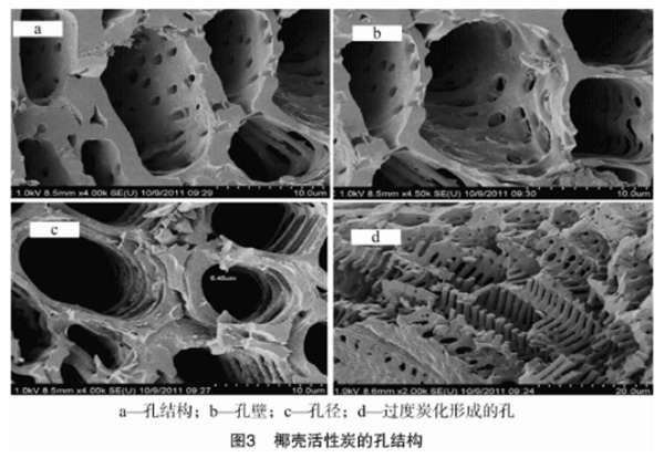 從圖3可以看出,椰殼活性炭的孔結(jié)構(gòu)較為發(fā)達(dá),孔的大小也比較均勻。在大孔的孔壁上,可以清楚地觀測(cè)到有較小的孔存在(圖3-a),小孔的大小也比較均勻,而且在孔結(jié)構(gòu)比較多的部分位置,孔壁甚至以網(wǎng)狀結(jié)構(gòu)出現(xiàn)(圖3-b)。椰殼活性炭表面比較均勻的孔直徑約為5-10um(圖3-c)。在部分活化過(guò)度的位置(圖3-d),可以清楚地看出即使椰殼活性炭的表面看起來(lái)的孔較少,但是內(nèi)部仍然具有非常發(fā)達(dá)的孔結(jié)構(gòu)。