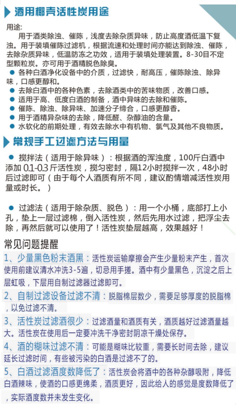 2.注意質量:購買時建議選擇正規渠道,并選擇優質的白酒活性炭,否則可能會影響到白酒的口感。